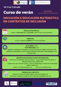 O proxecto EAMARE-STEAM organizou un obradoiro titulado: Educación Matemática en contextos de inclusión para estudantes universitarios. O obradoiro celebrouse en Santiago de Compostela do 12 ao 15 de xuño de 2017. Esta iniciativa formou parte da programación dos cursos de verán da Universidade de Santiago de Compostela.