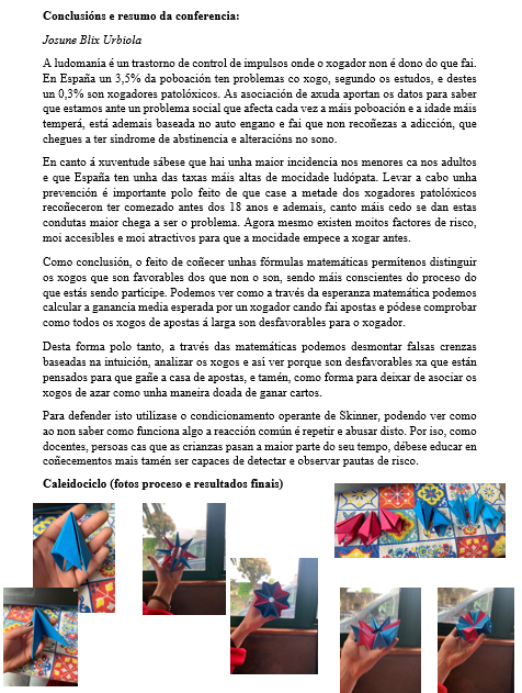 Para conmemorar o Día Escolar das Matemáticas, o GIDEM-TESELA organizou o 12 de maio unha dobre xornada divulgativa programando a conferencia APOSTA POLA EDUCACIÓN! O PAPEL DAS MATEMÁTICAS NAPREVENCIÓN DA LUDOPATÍA, a cargo de Alejandro Pazos Pazos, e o obradoiro MATEMÁTICAS DOBRANDO PAPEL, impartido por Mª Trinidad Pérez López e Teresa Otero Suárez, todas elas docentes de matemáticas en educación secundaria.